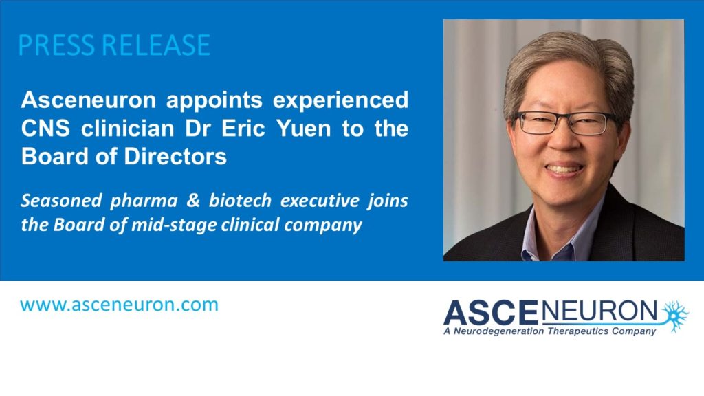 Asceneuron, an emerging leader in the development of orally bioavailable modulators of tau for the treatment of neurodegenerative diseases, today announces the appointment of Dr Eric Yuen to its Board of Directors.